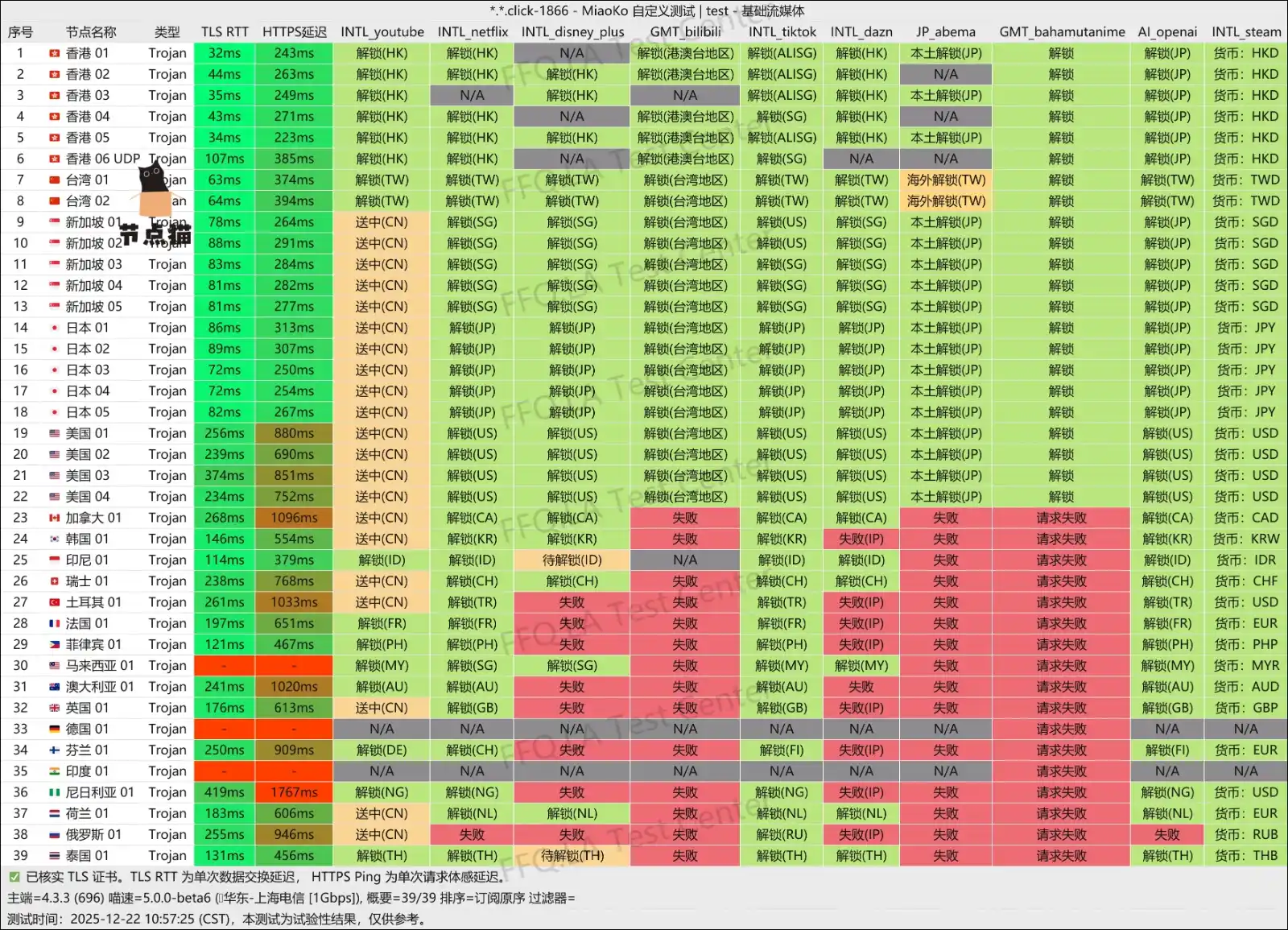 注:不同地区的连接到同一节点,Ping 值也会不同,节点猫此处会选择广东、上海等地的测速节点进行 Ping 值参考。目前大家手里用的 Clash 或 Shadowrocket 测出来的 Ping 值都不具备参考意义,只适合当作一个连通性参考。自己测 Ping 值建议通过专门的 speedtest 网站进行,不同地区的 Ping 值差别很大,请参考同一地区节点的不同服务商节点的 Ping 值进行比较。